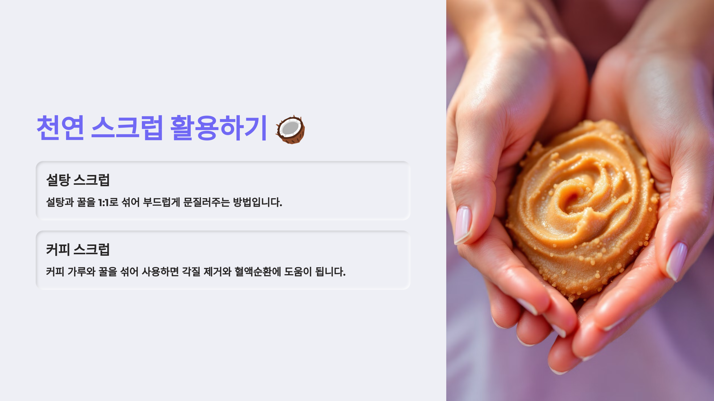 자연 재료로 만든 스크럽은 자극을 줄이면서도 효과적으로 각질을 제거할 수 있습니다.