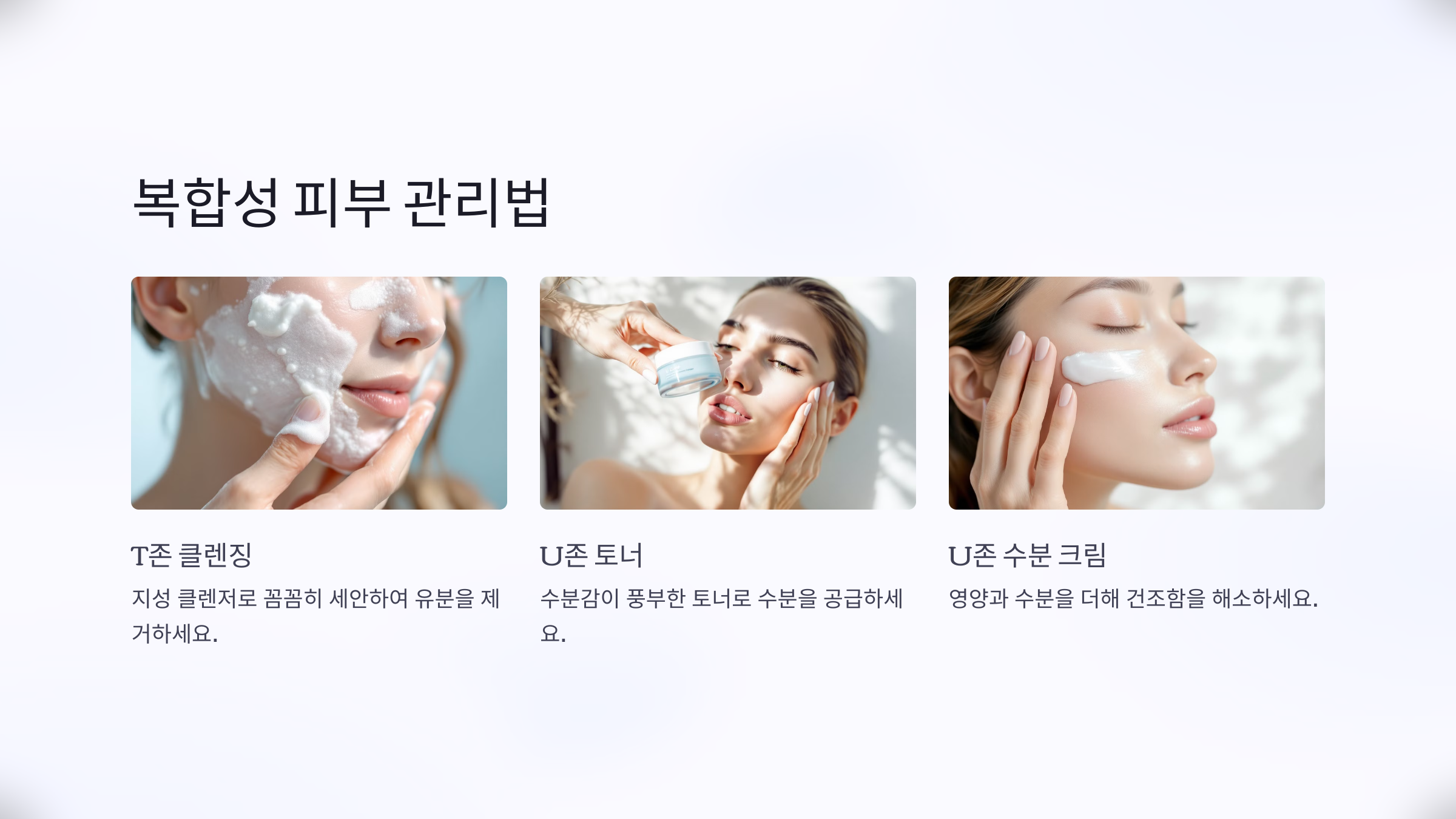 - 이중 클렌징: T존에는 지성 클렌저, U존에는 보습 클렌저를 사용하는 이중 클렌징을 추천합니다.