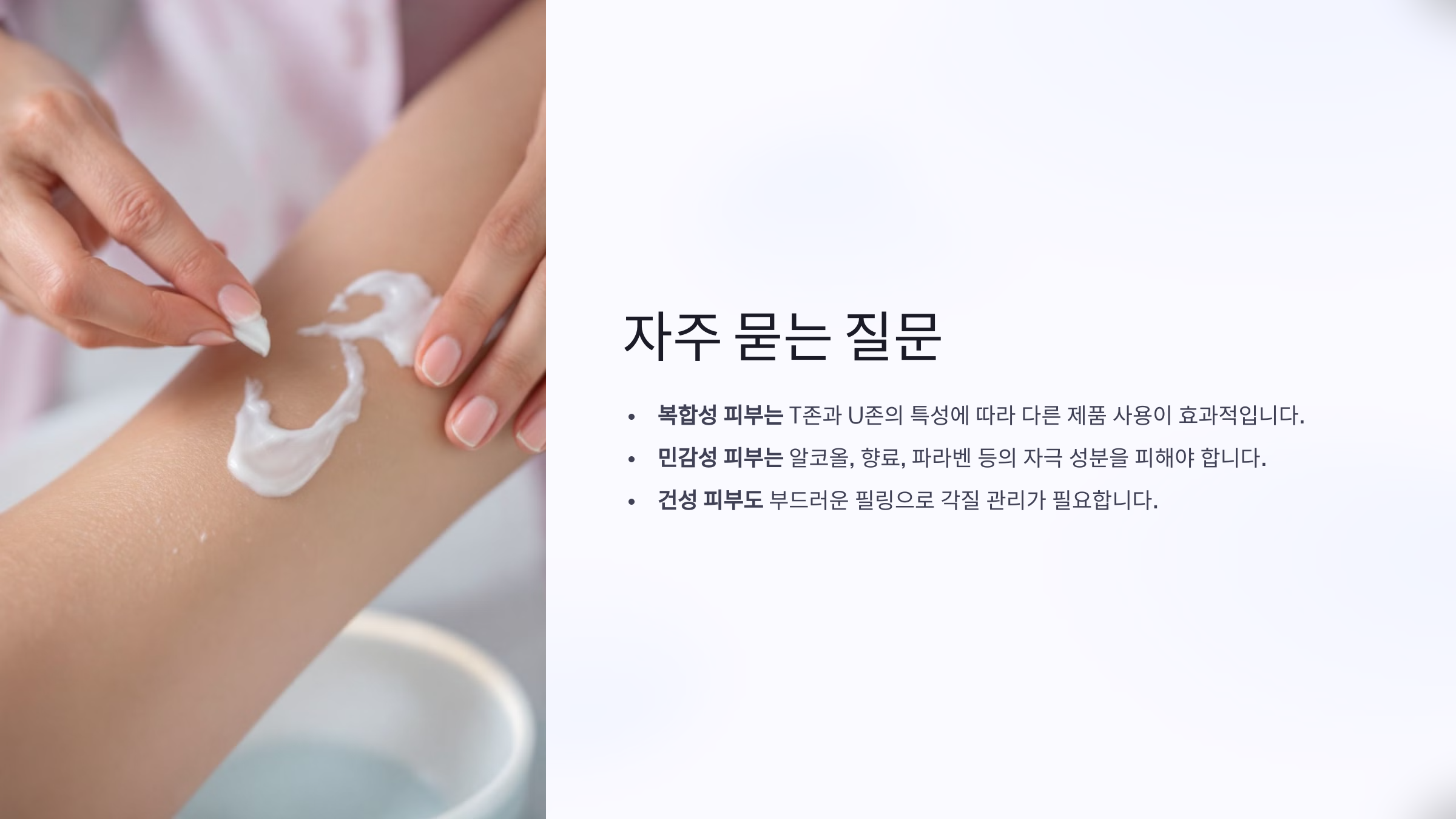 - 팩 활용: T존에는 피지 관리 팩을, U존에는 보습 팩을 사용하여 부분별 맞춤 관리가 중요합니다.