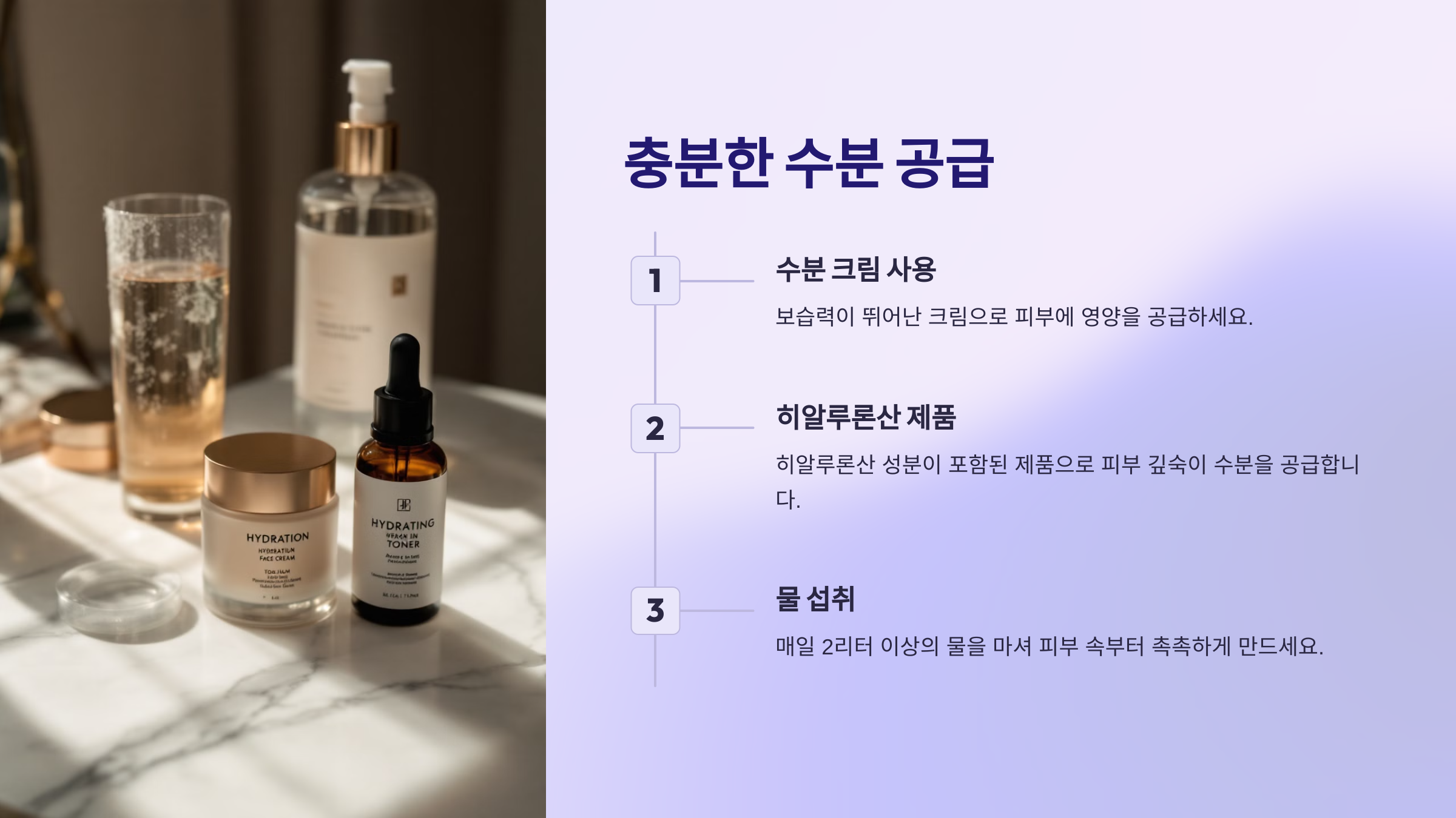 A5: 수분 크림 사용과 충분한 물 섭취가 가장 효과적입니다. 피부가 건조하지 않도록 꾸준히 관리하는 것이 중요합니다.