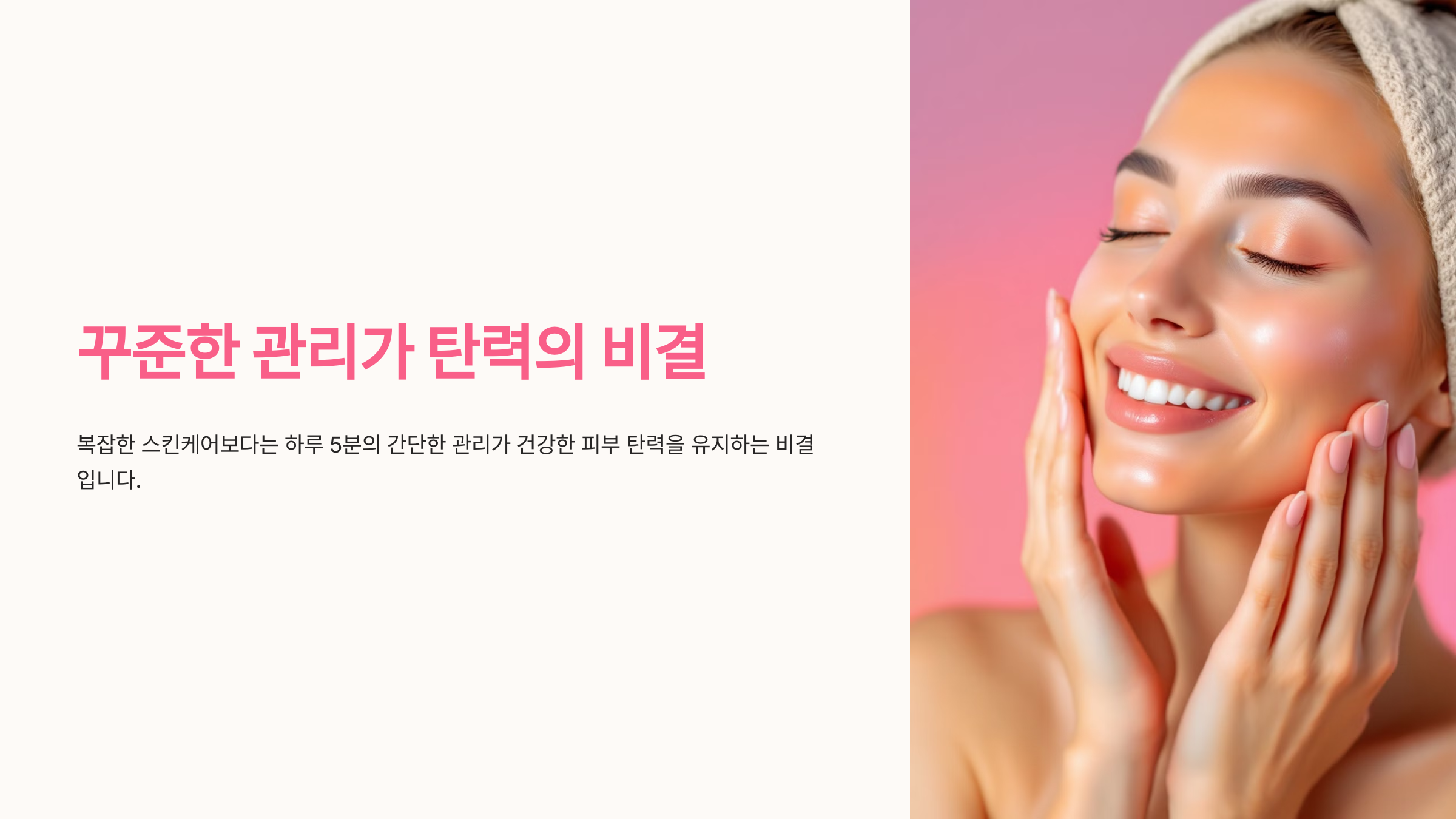 피부 탄력을 유지하기 위해서는 복잡한 스킨케어보다는 꾸준하고 간단한 관리가 중요합니다. 하루 5분, 위에서 소개한 간단한 단계를 실천함으로써 건강한 피부 탄력을 유지할 수 있습니다. 꾸준히 실천하여 탄력 있는 피부로 동안 외모를 유지해보세요. 💖