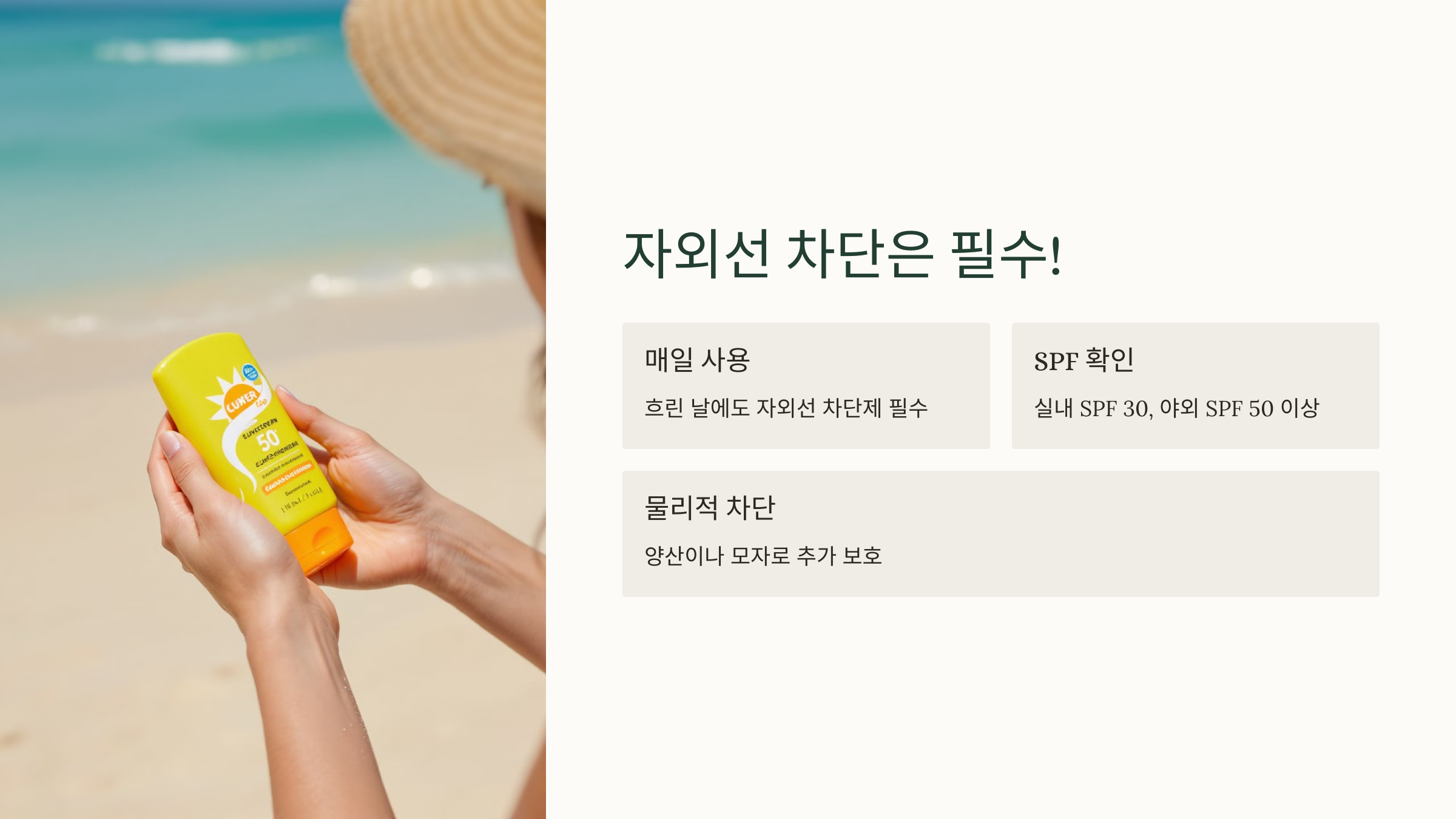 - 자외선 차단제 매일 바르기: 자외선은 흐린 날에도 영향을 미칩니다. 야외 활동이 많지 않아도 매일 아침 자외선 차단제를 바르는 습관을 들이세요.