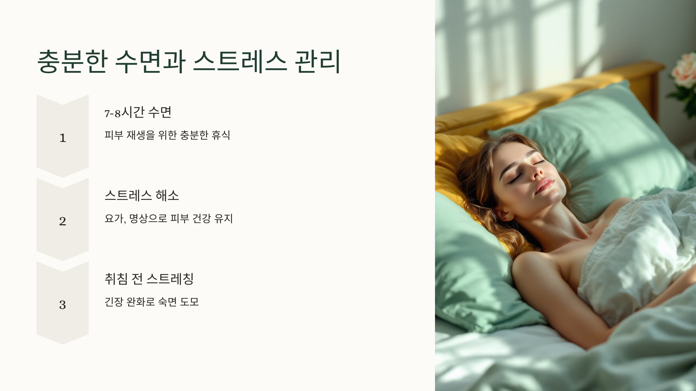 피부는 우리 몸의 상태를 그대로 반영하는데요. 충분한 수면과 스트레스 관리는 피부 톤에도 큰 영향을 미칩니다.