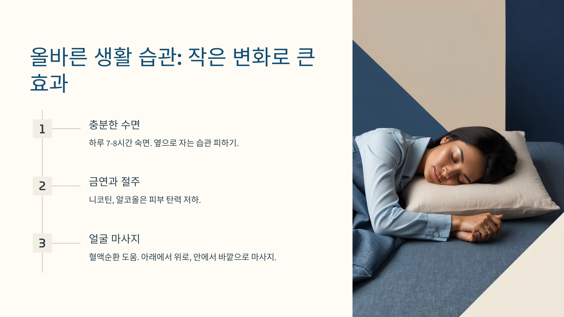 수면 부족은 피부 재생을 방해하고, 눈가와 이마 주름을 초래합니다. 하루 7-8시간의 충분한 숙면을 취하며, 옆으로 자는 습관은 피하는 것이 좋아요. 베개 자국이 주름으로 이어질 수 있거든요! 😴